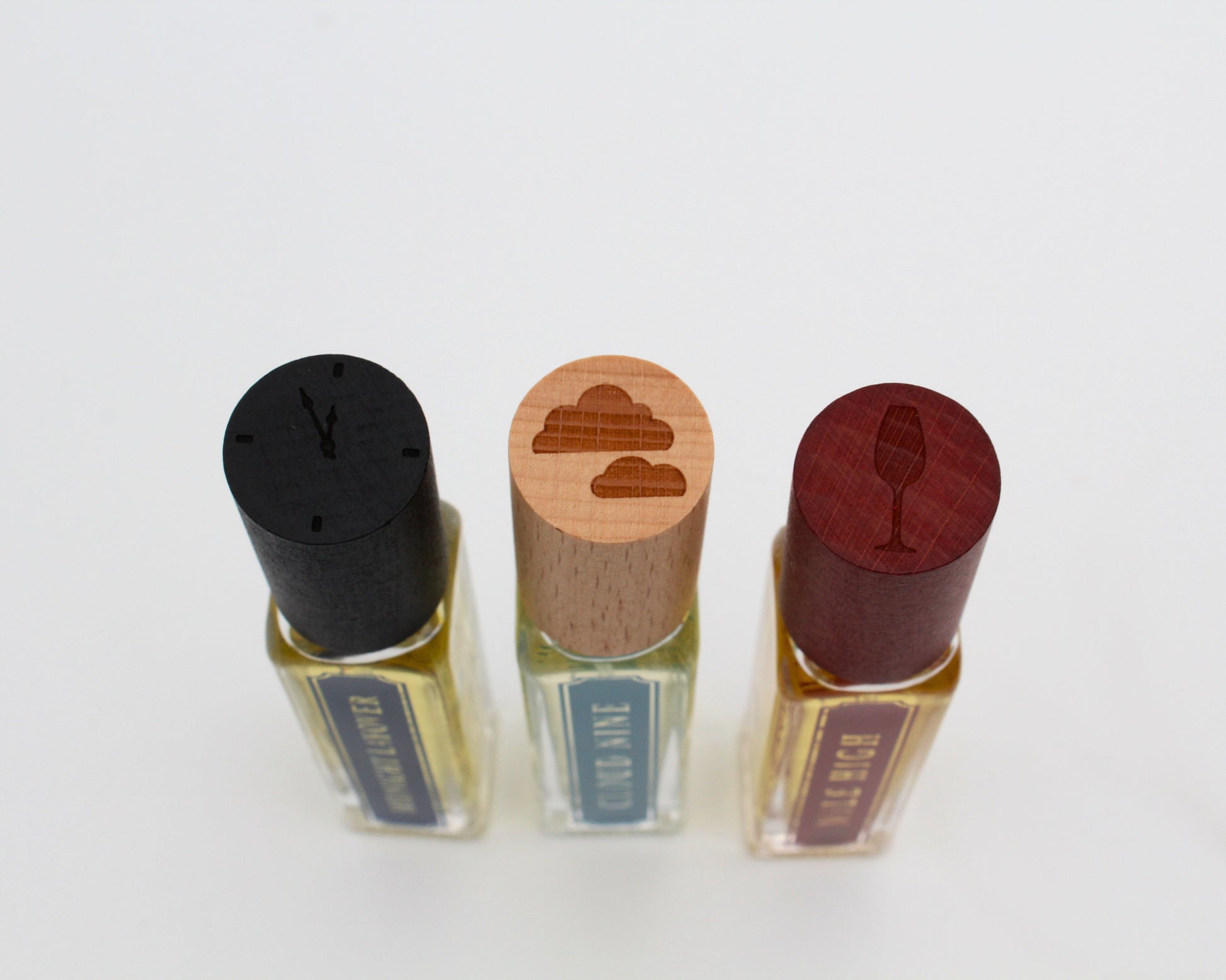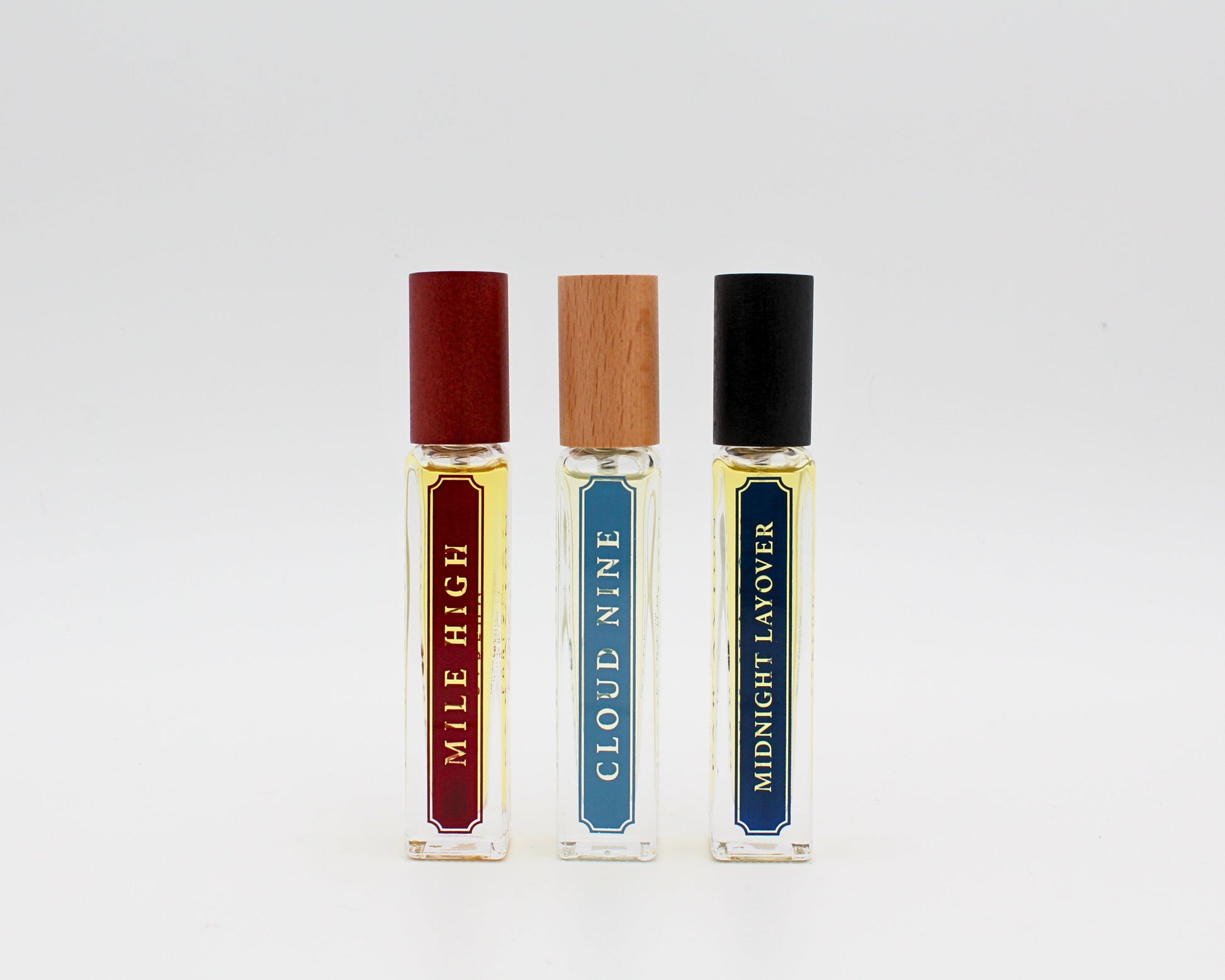 The Long Haul includes 3 × 15 ml bottles of Mile High, Cloud Nine, and Midnight Layover - each crafted in our signature refillable rectangular design and finished with wooden lids featuring engraved debossed emblems.